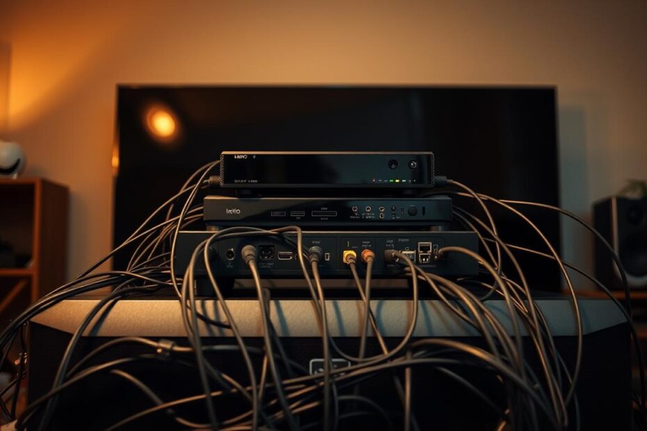 A living room setting with a flatscreen TV on a modern entertainment center. In the foreground, a cable box or set-top box is positioned next to the TV, with various cables and connectors leading from the box to the TV. The scene is lit with warm, natural lighting, creating a cozy, domestic atmosphere. The TV screen displays a message or an error code indicating a connection issue between the box and the TV. The composition is balanced, with the TV and box taking up the central focus, surrounded by subtle details that complement the scene.