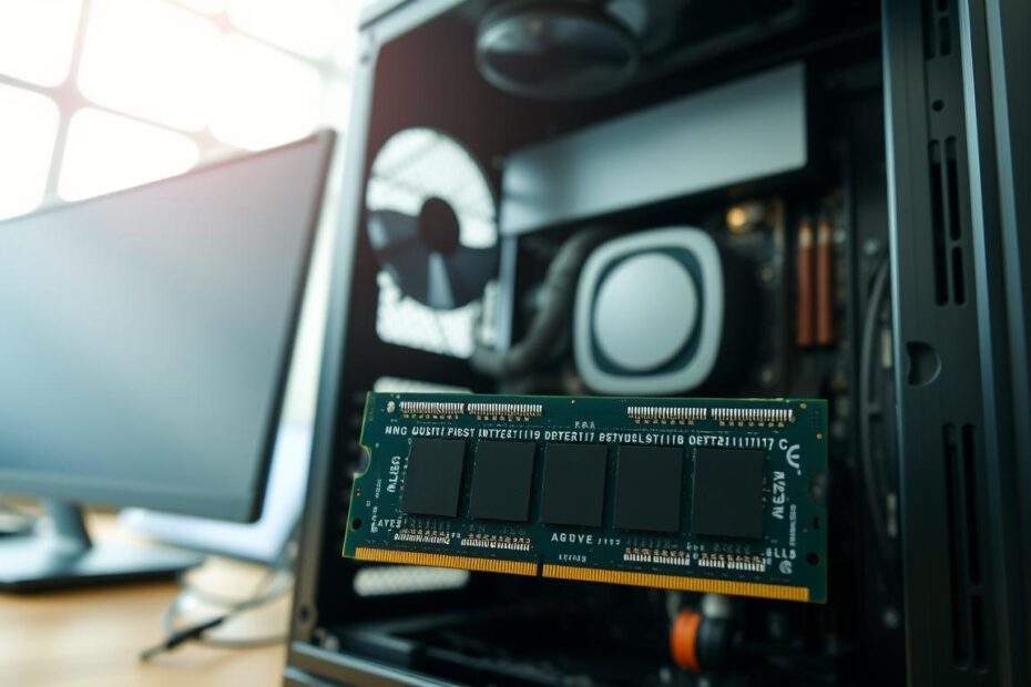 A modern, sleek desktop computer with a transparent side panel, revealing the internal components. The RAM modules are highlighted, with their specifications and performance metrics displayed on the screen. The lighting is soft and natural, casting a warm glow over the scene. The composition emphasizes the centrality of the RAM, with the other components fading into the background. The overall atmosphere is one of technological sophistication and attention to detail, conveying the importance of understanding and optimizing the computer's memory capabilities.